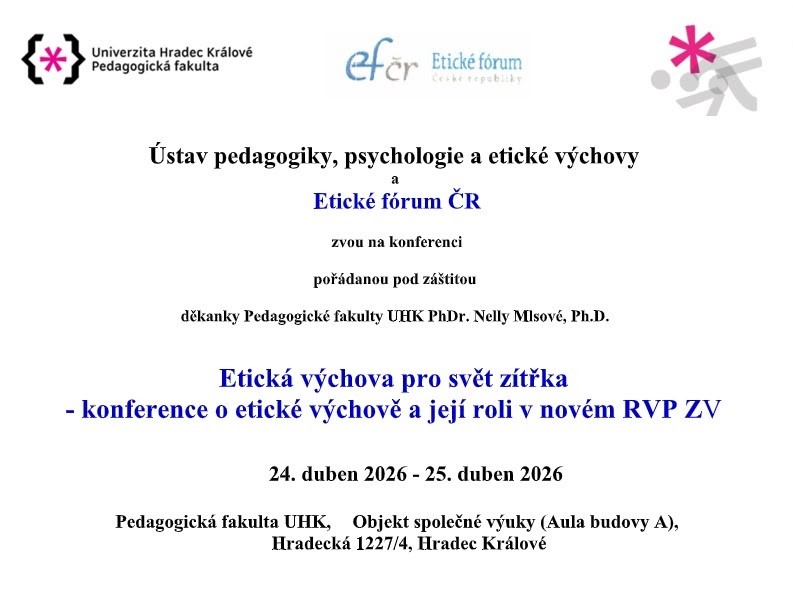 Etické fórum ČR pro vás ve spolupráci s Pedagogickou fakultou UHK – Ústavem pedagogiky, psychologie a etické výchovy připravuje dubnovou konferenci pod názvem Etická výchova pro svět zítřka – konference o etické výchově a její roli v novém RVP ZV.